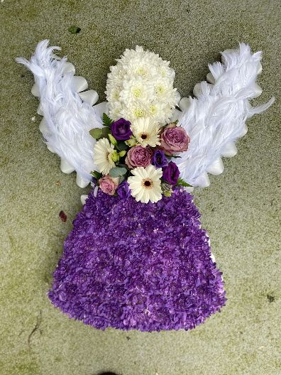 A beautiful angel tribute complete with Carnations, Chrysanthemums and Feathers available in any colour of your choice.